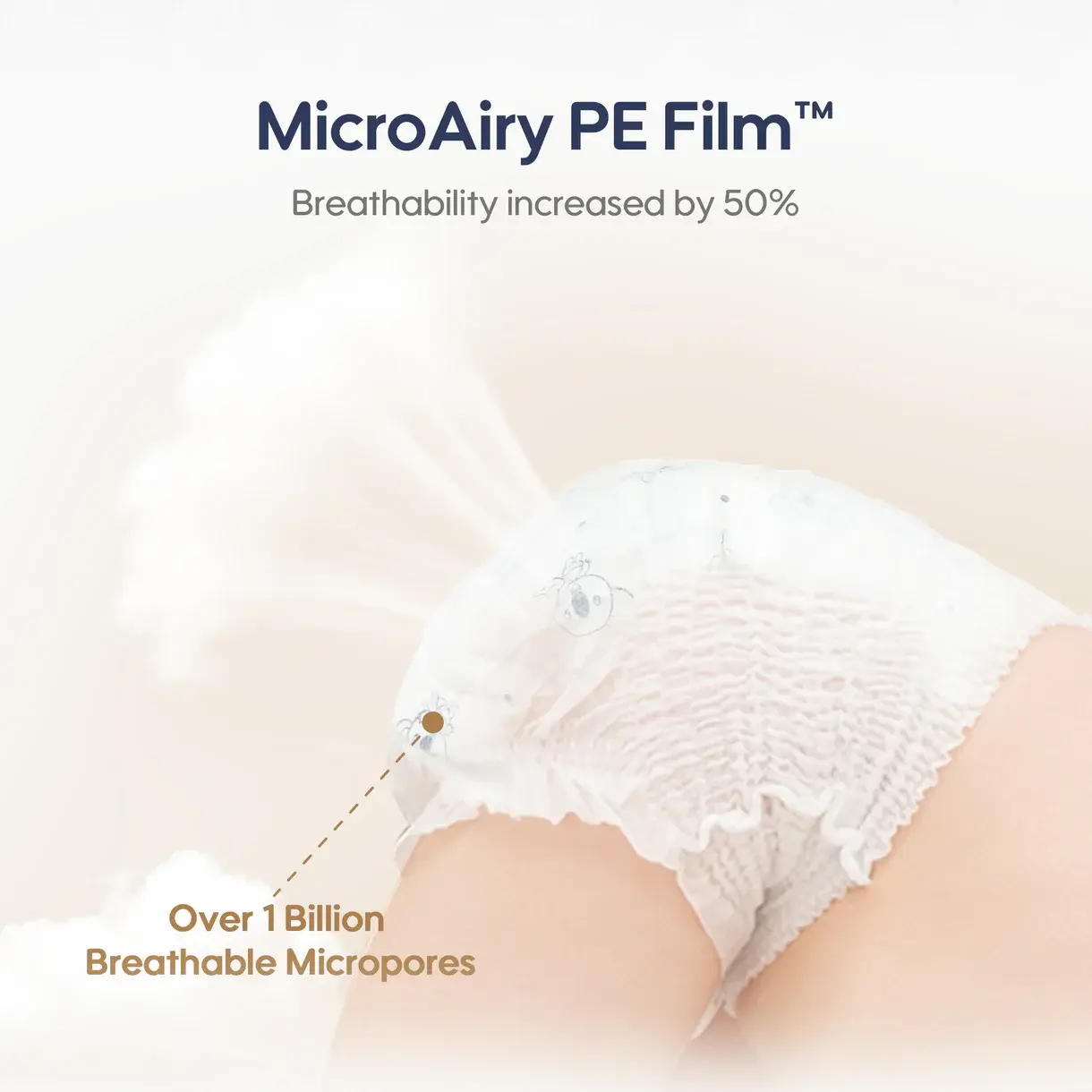 Exclusive MicroAiry Film™, designed with billions of ultra-fine micro-pores. This breathable PE film allows air to flow freely while preventing water from passing through, increasing breathability by 50%.