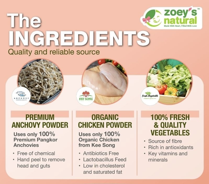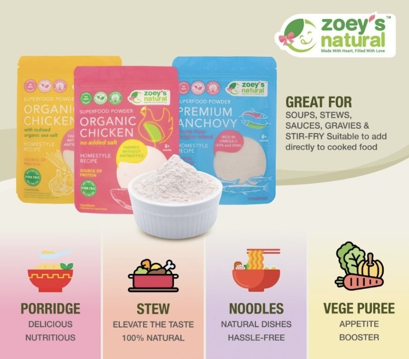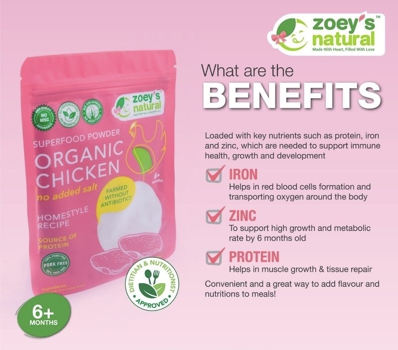 Our organic chicken powder is made with certified organic chicken breast. The ingredients are simmered in low heat over 12 hours to preserve the nutrients. It is naturally loaded with key nutrients such as protein, iron and zinc, which are needed to support immune health, growth and development. With this organic chicken powder, a simple and hearty meal can be ready in seconds. It is also easy to take on the go! This product is made with 100% natural ingredients and contains no added sugar, preservatives or artificial colouring and flavouring. It is as tasty and nutritious as homemade. Rest assured that your little one will be getting enough essential nutrients.